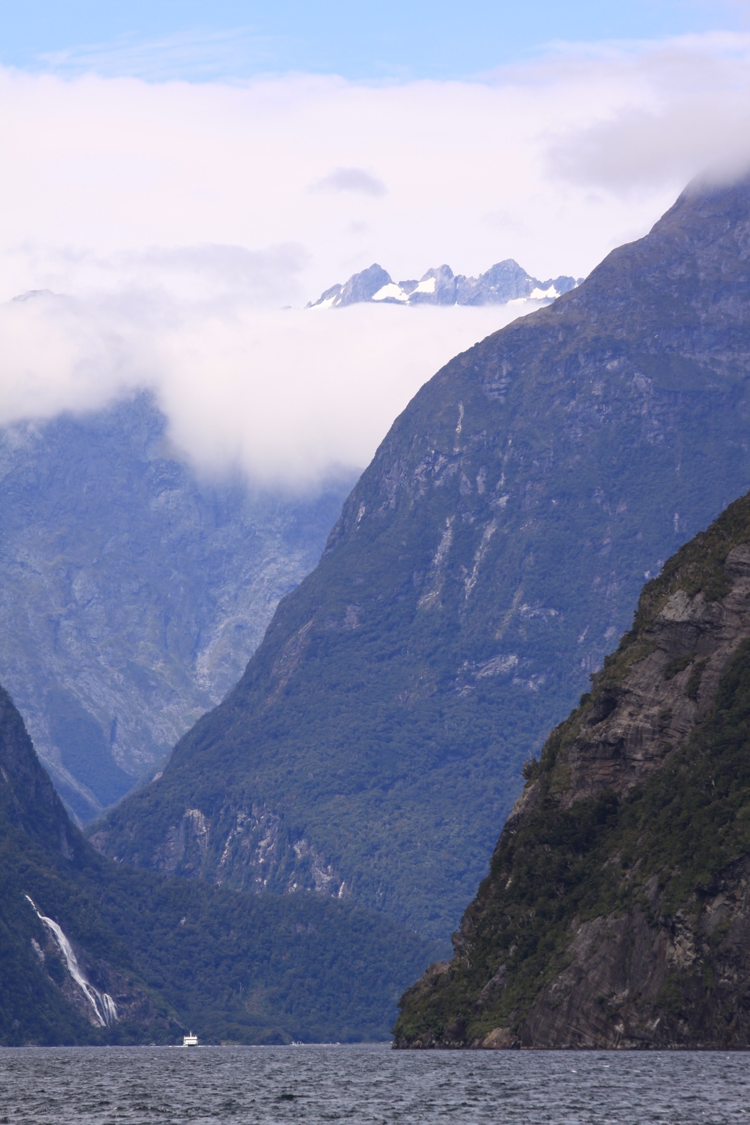 We saw thousands of sheep today along with cattle and deer which they raise on farms. The deer are released into the wild during hunting season so that hunters have game to shoot. If Milford Sound were in the northern hemisphere, it would be at the same latitude as Portland, Oregon. We had a four hour trip from Queenstown to Milford Sound, and then we were given a picnic lunch as we boarded a boat for a two hour cruise.