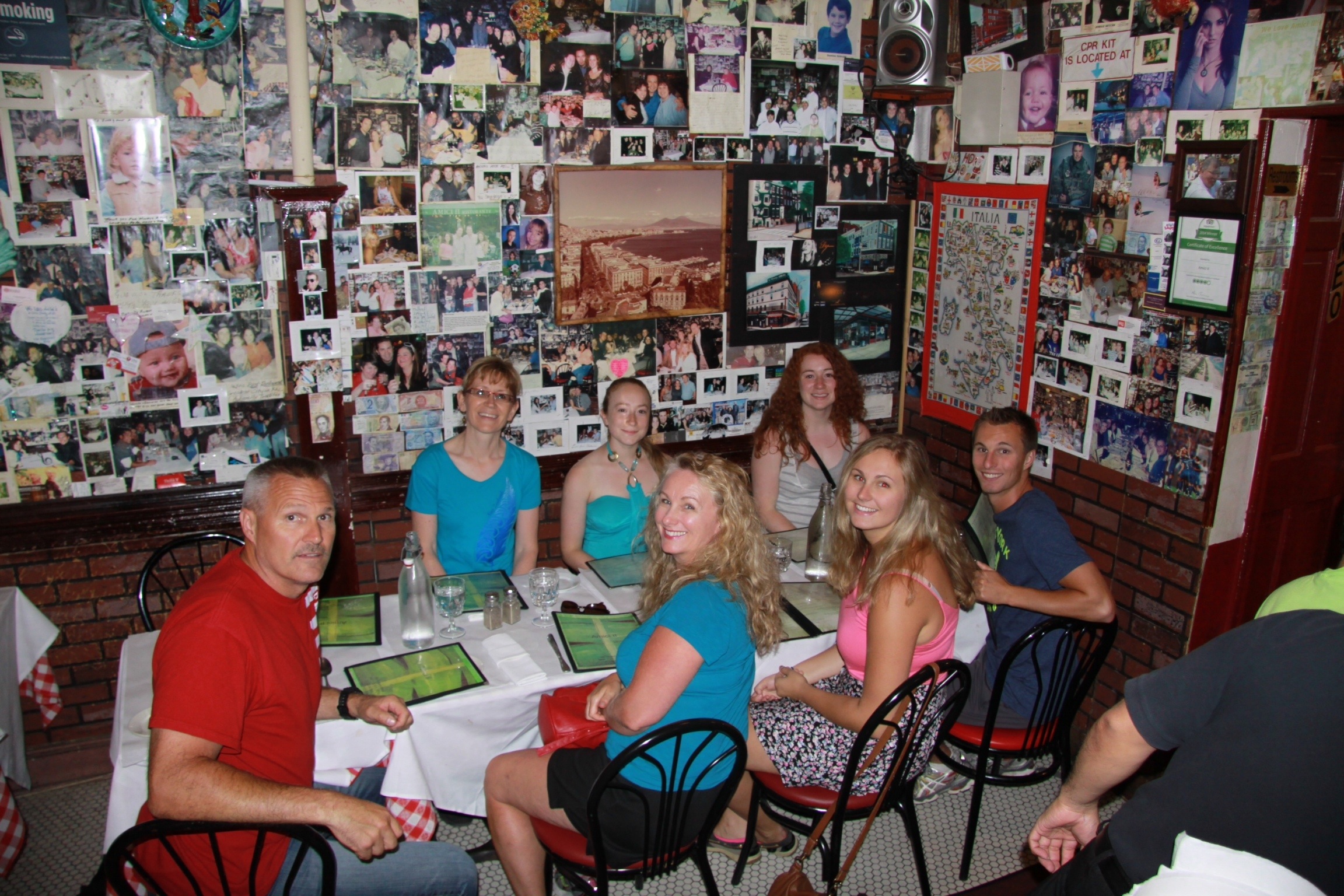 By this time we were ready for supper, and what better place to be on a Saturday night than Mulberry Street in Little Italy? The streets were blocked off and there were many vendors selling their wares. We ate at a delightful restaurant called “Amici II Ristorante”. We enjoyed rigatoni, ravioli, fettuccine, penne, spaghetti, gnocchi, and pizza!! This was preceded by delicious fresh bread smothered in garlic and herb soaked olive oil. We smell awesome!!