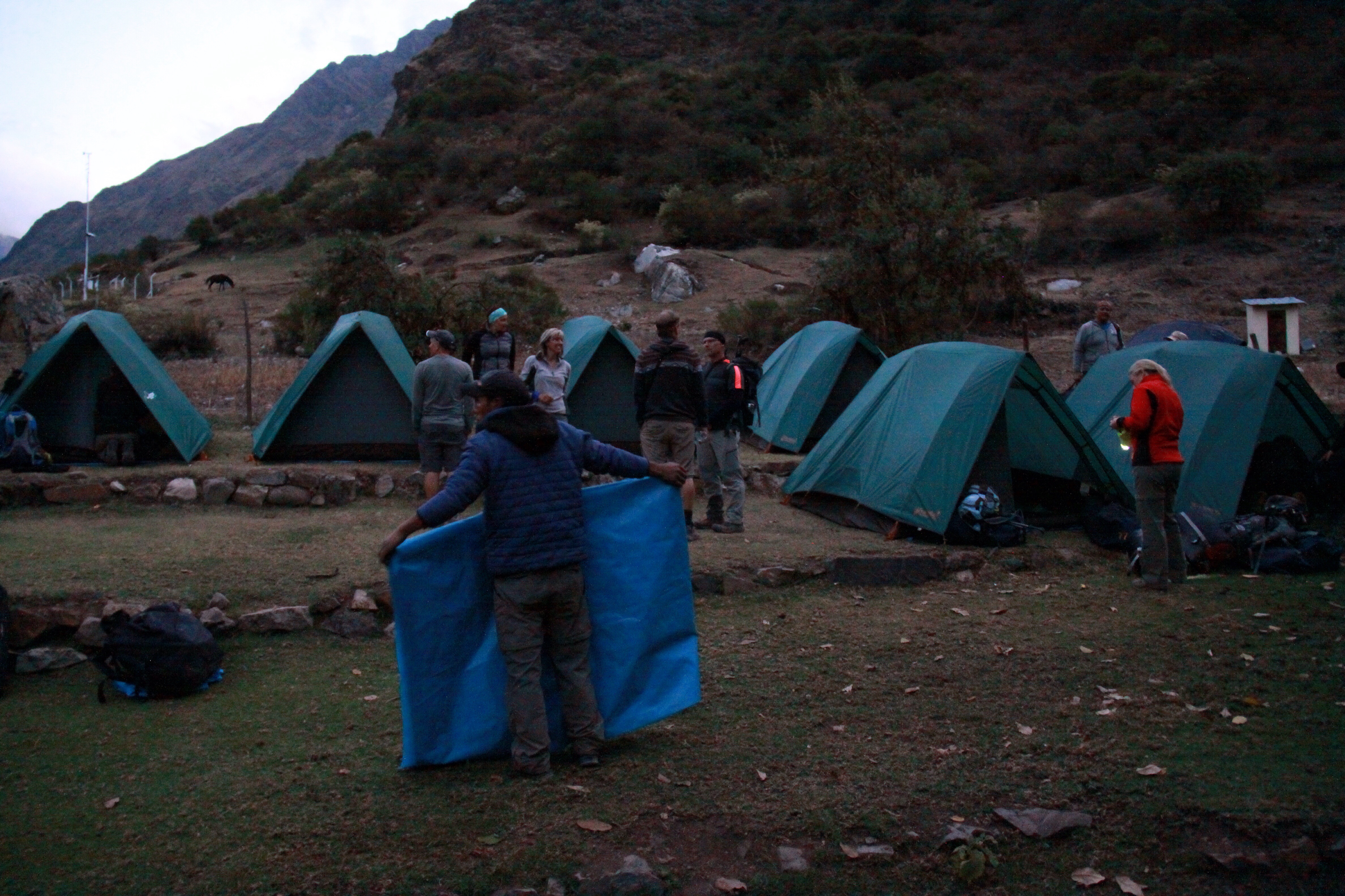 There was nervousness and excitement as we got up early and packed a few last minute items into the bags that the porters would carry. We had to carry our gear down the mountain to a spot where we could meet the bus, and we were on our way around 6:40. We stopped at a village so our cooks could purchase a few more groceries, and on we went to the starting point at km 82. Our group met with others in the staging area where porters packed their loads (up to 25kg), and we awaited our turn to go through the checkpoint to start.