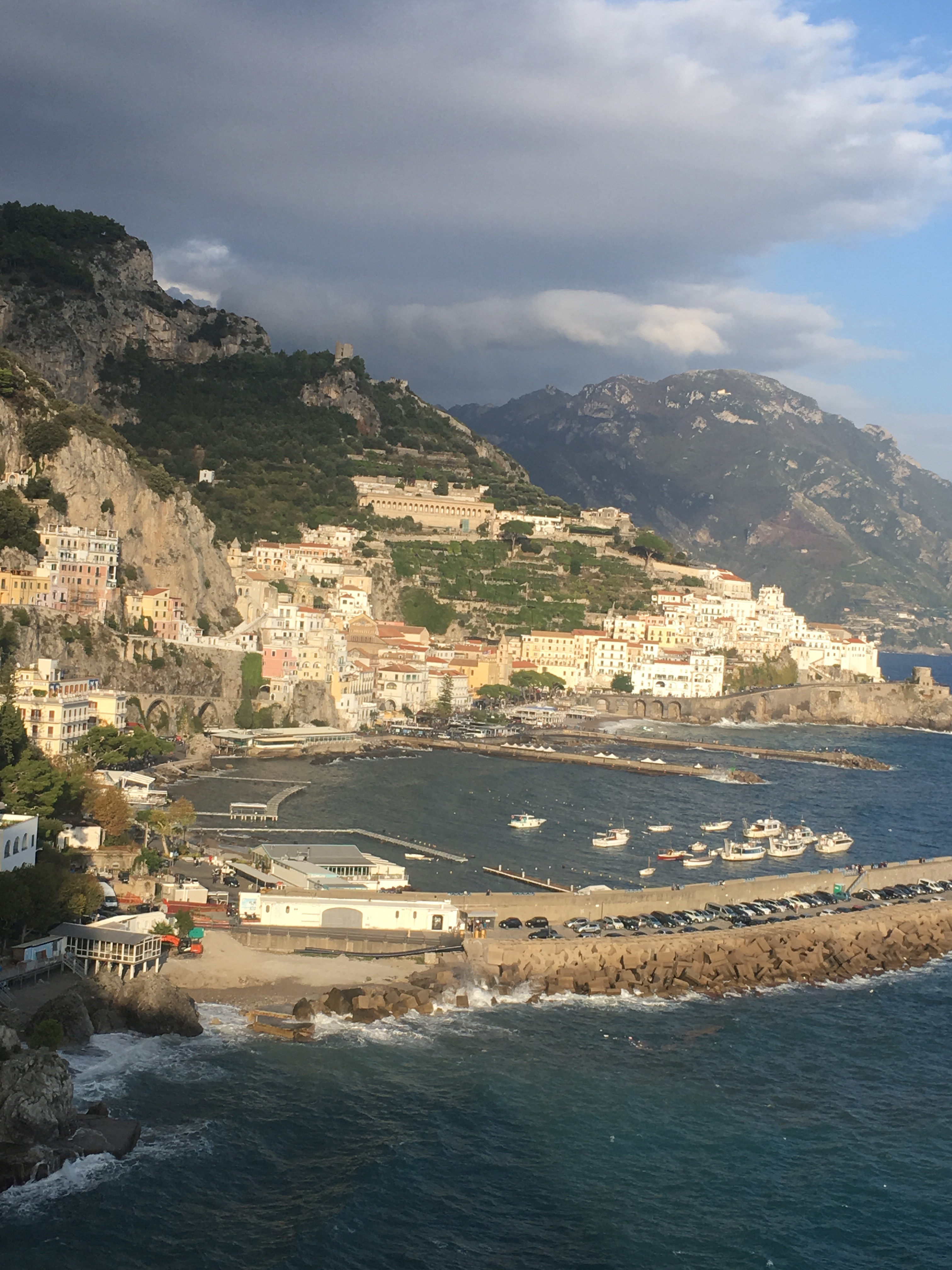 Today we left our Palace in Florence and headed to the train station to find that our train was delayed. Thankfully it did arrive, and we enjoyed the high speed train through the Italian countryside. Arriving in Naples, our trusty Mercedes van driver picked us up and drove us to Amalfi. He spoke not a lick of English except “no”and “voucher”. We climbed up a mountain via zig zag narrow roads, passed through a mountain tunnel, and wound down the mountain until we reached the Tyrrhenian Sea. We think he pointed out Mount Vesuvius and the ocean to us, but we were feeling pretty green by the time we arrived at the Miramalfi Hotel.