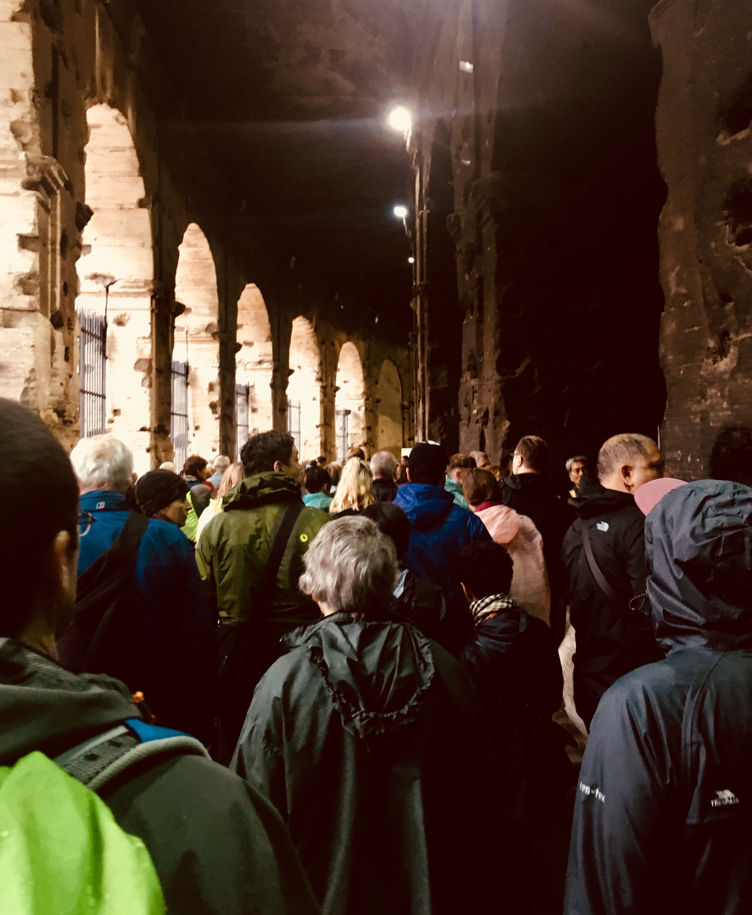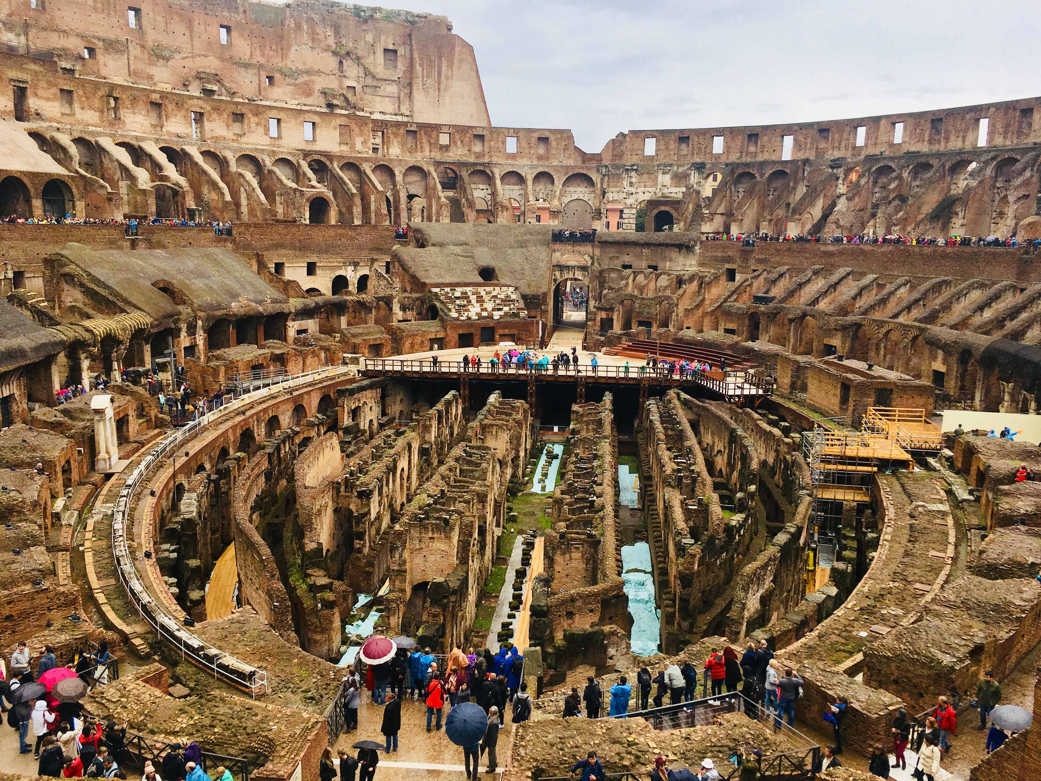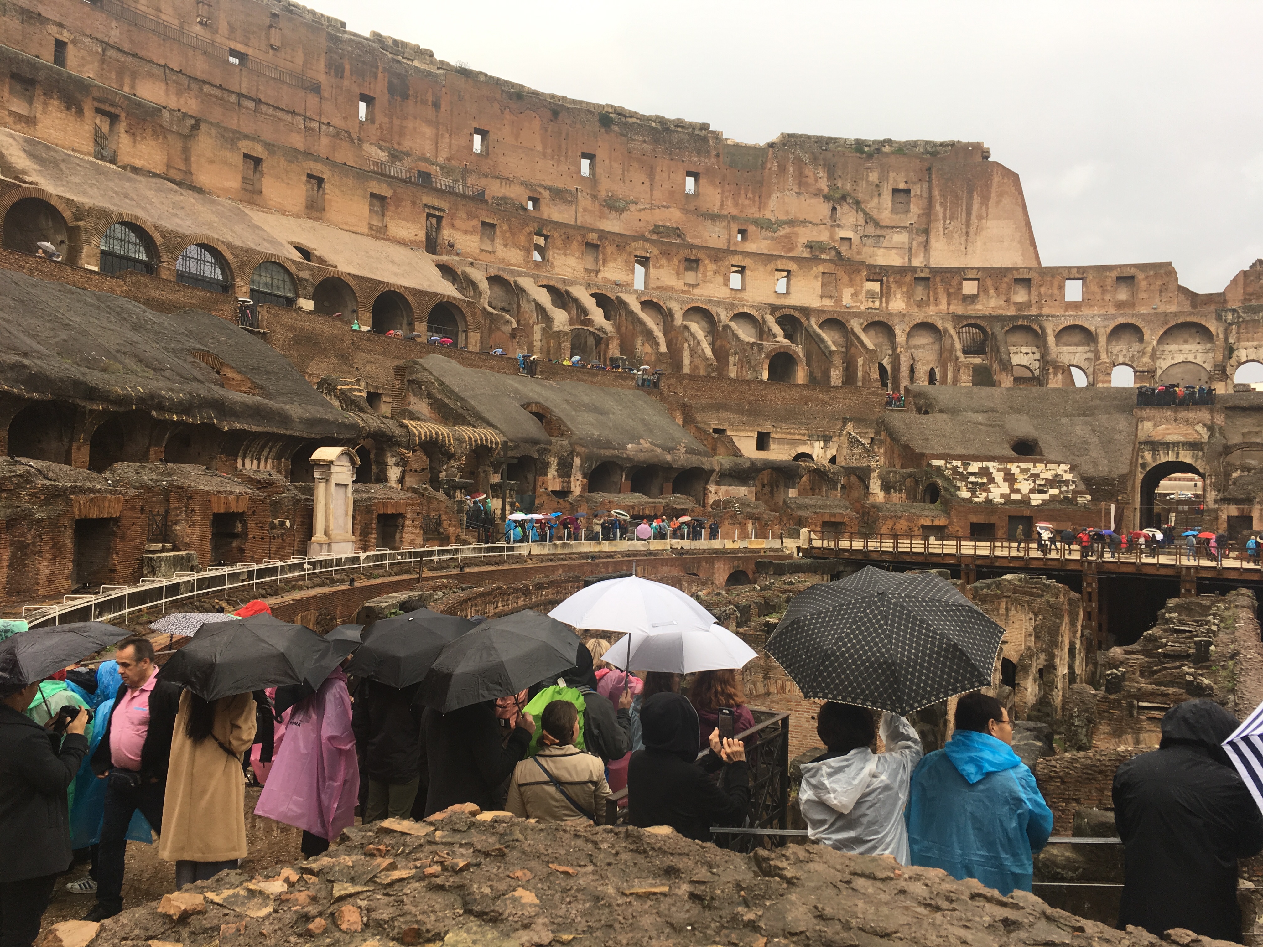 Instead of walking to the Colosseum, we took the metro to keep us a bit drier. I wondered if the rain would keep the crowds away, and thousands of others must have thought the same thing as they headed to the same place. After purchasing tickets and clearing security, we explored this colossal structure and listened to our audioguide.