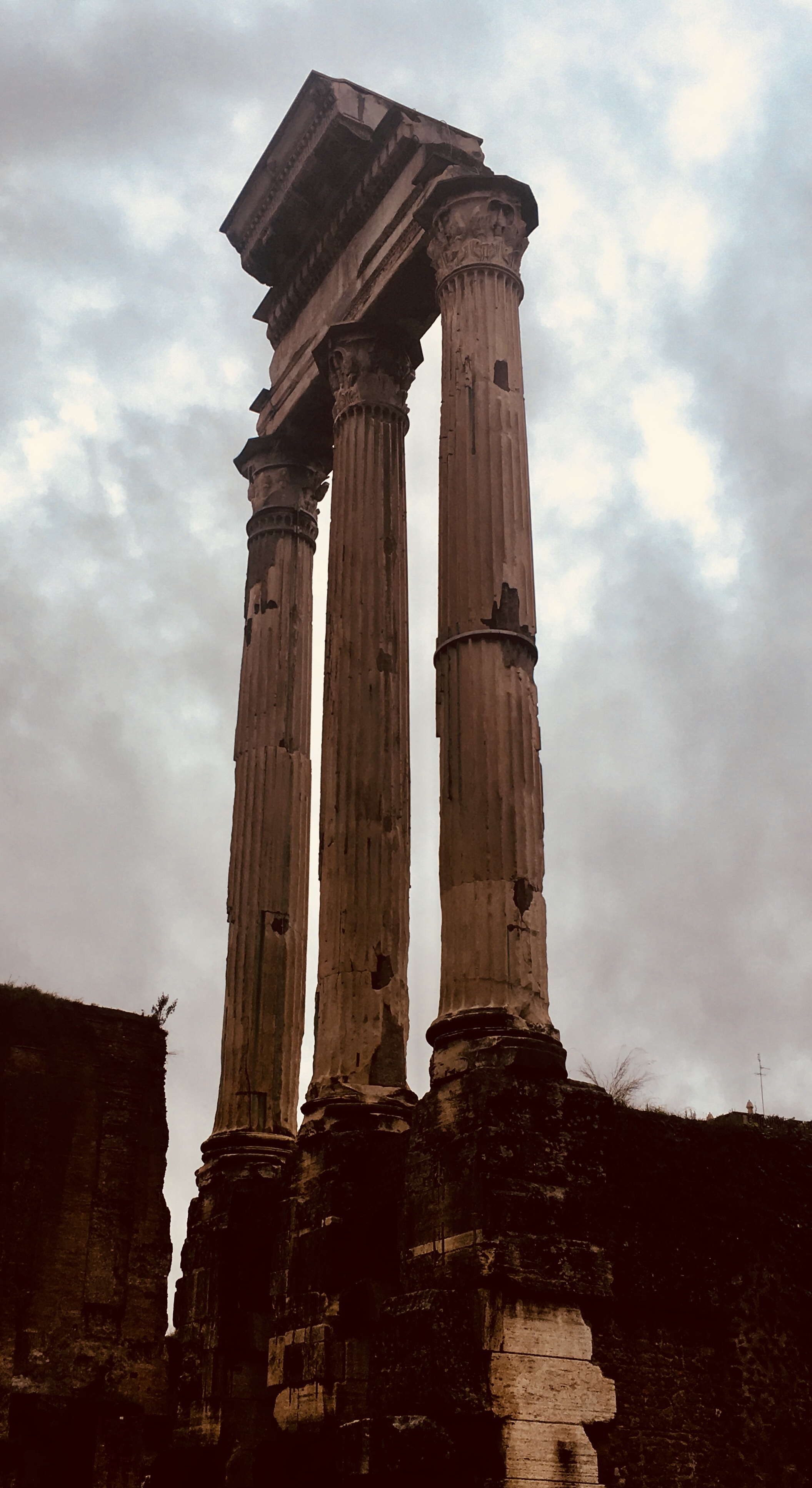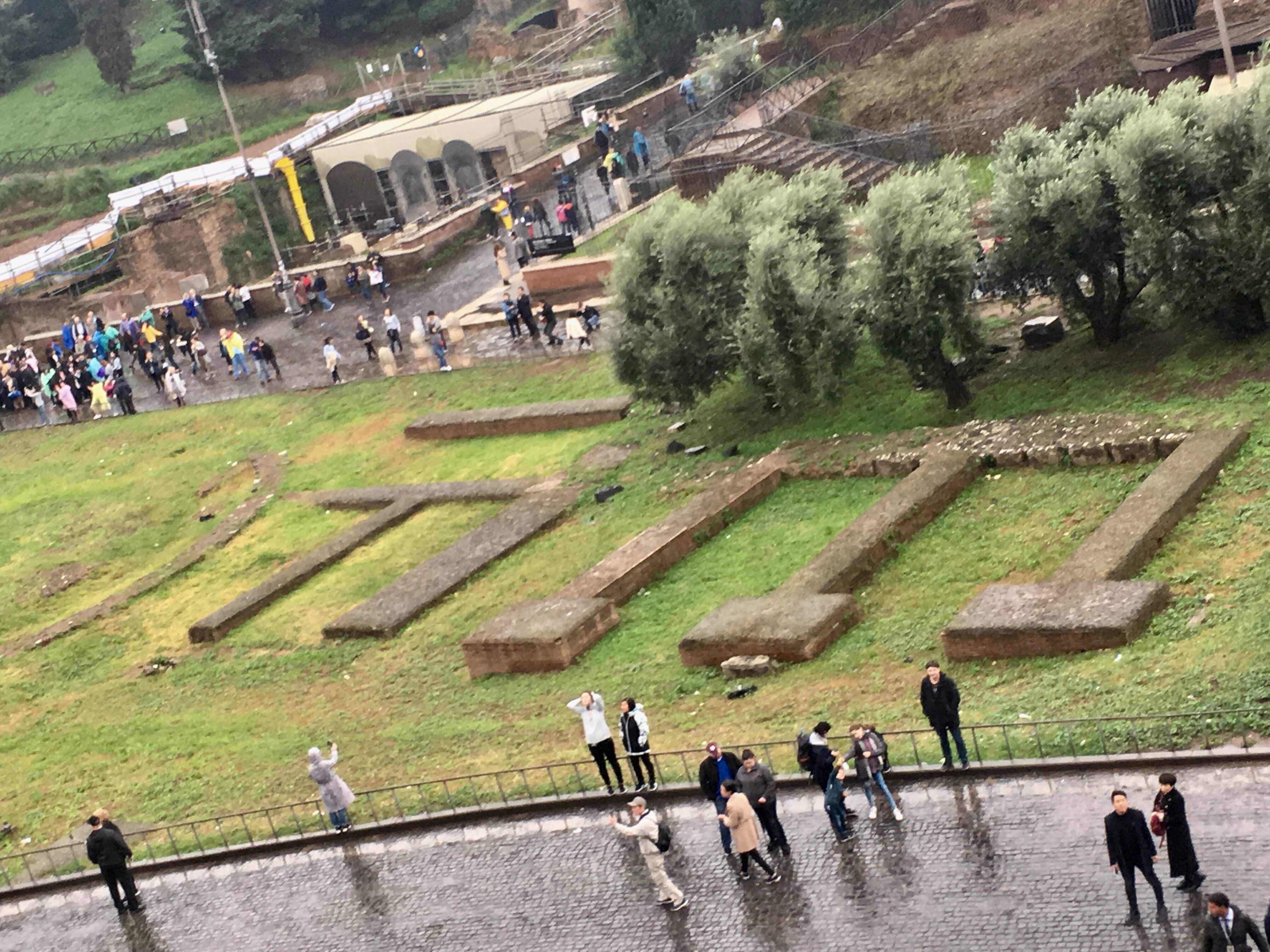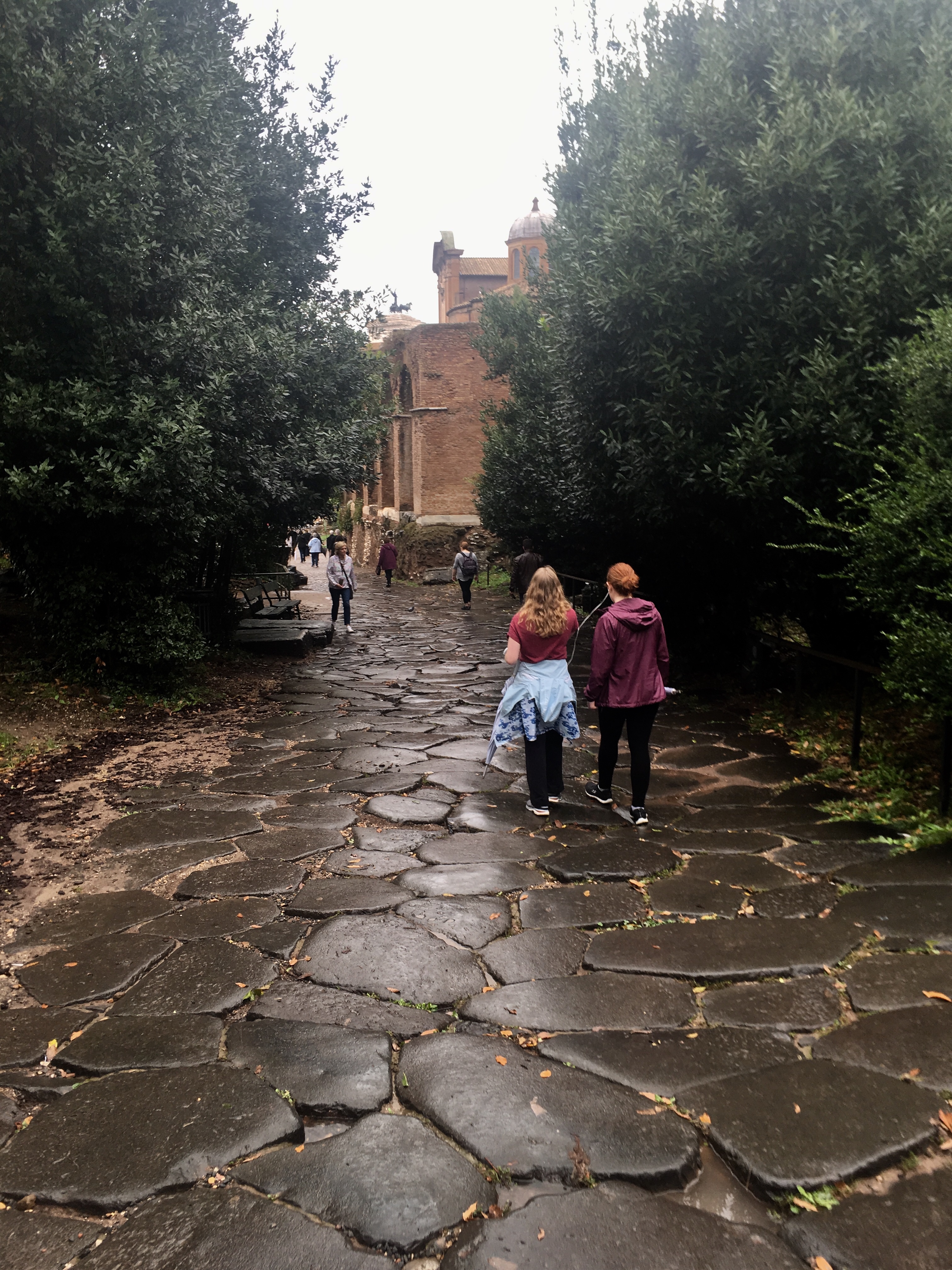 Thankfully, the rain lessened and we moved on to the Roman Forum. This was basically downtown ancient Rome with all of its temples, legal buildings, and shops. People used to live on top of here and had to move away when they excavated the area.