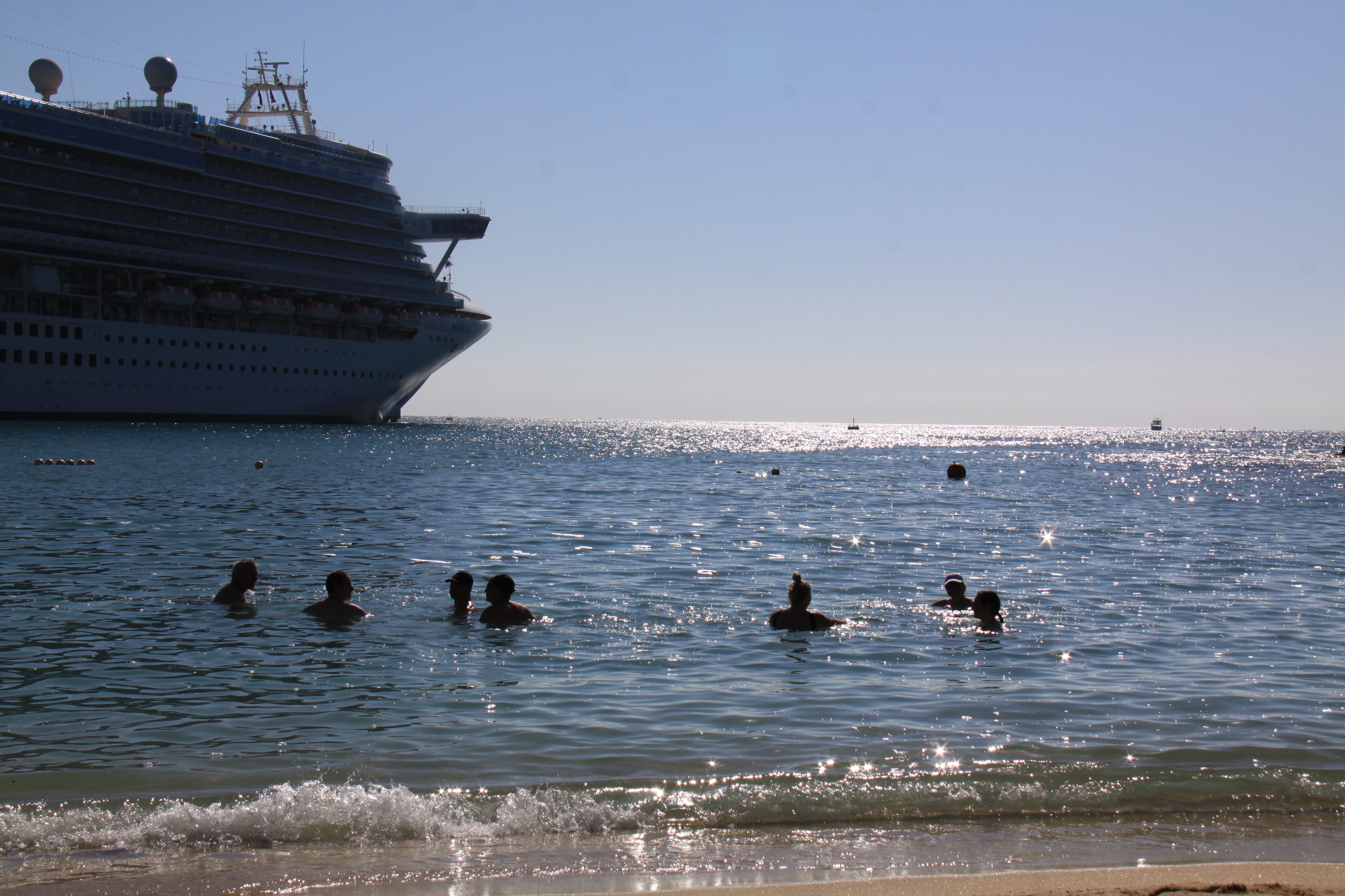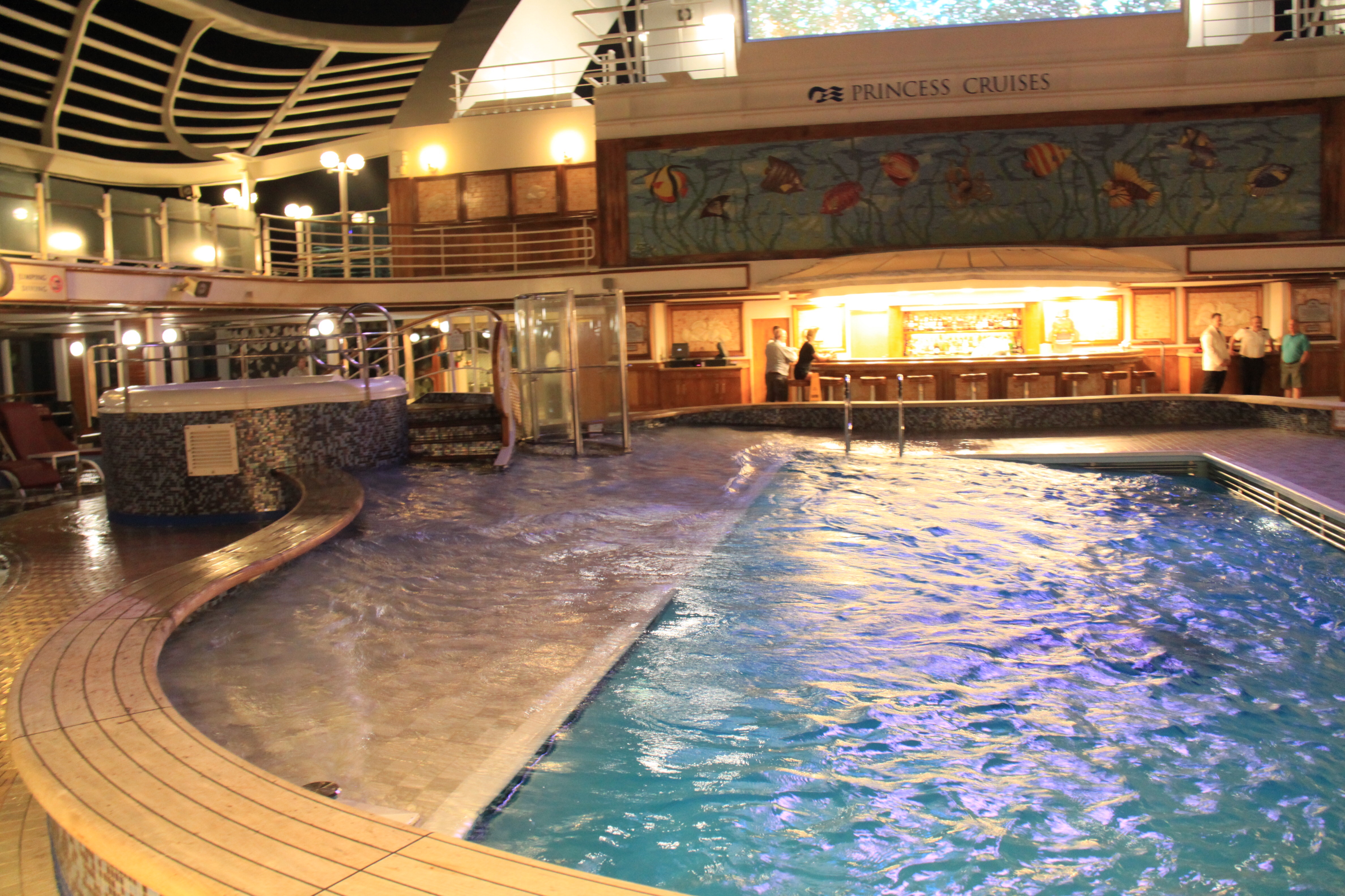 After leaving this lovely port, we were faced with a hurricane 2 force wind of up to 80 knots or 148 km per hour. The ship was at an angle of several degrees for several hours, and this caused food to fall off of the buffet and water to flow out of the pools.
