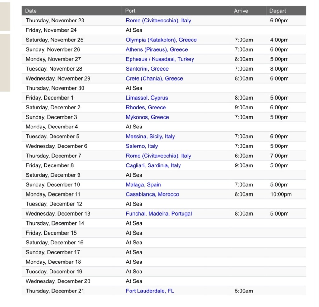 We’re just getting ready to take a shuttle to the Civitavecchia cruise port where we will get on our ship. The Island Princess will be our home for the next 28 days as we spend three weeks in the Mediterranean and then cross the Atlantic to Fort Lauderdale. I will post our schedule here so that you can follow if you’d like. We may or may not have Internet along the way, so I will update when I can.