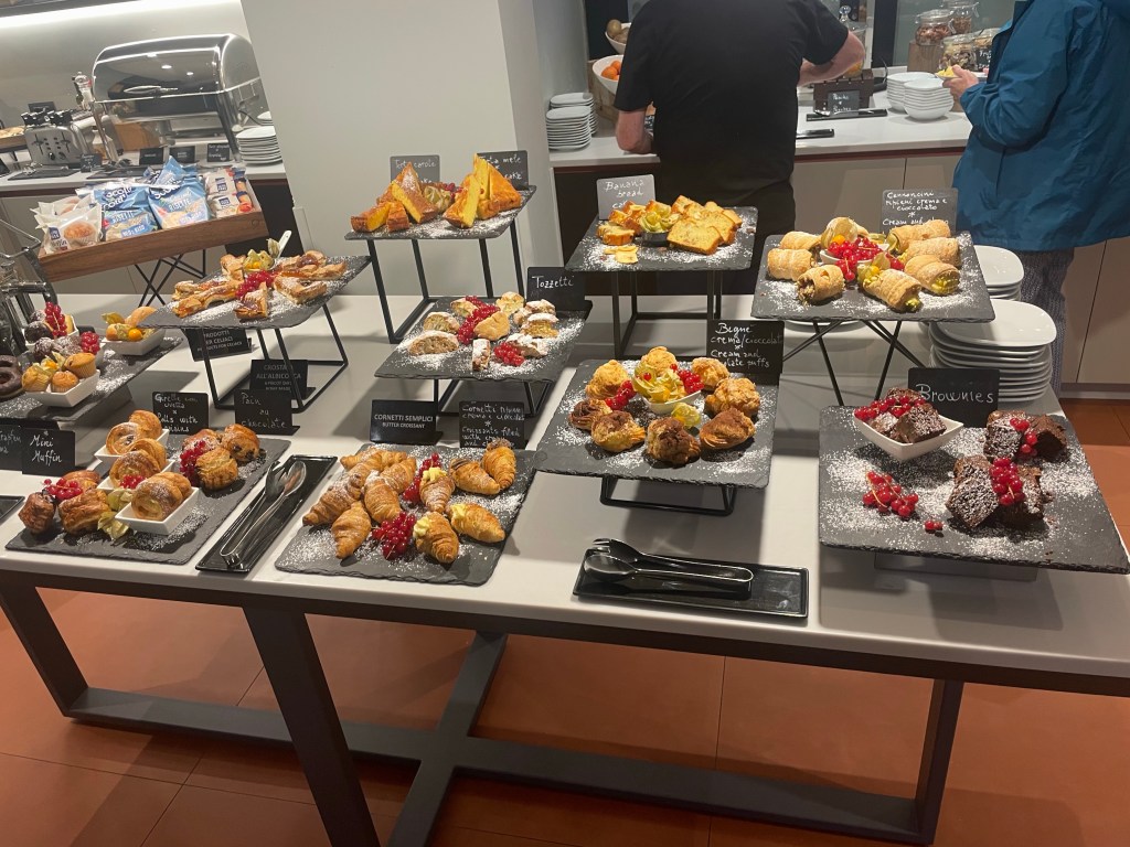 This morning we were treated to a beautiful breakfast at our hotel. So, if brownies for breakfast is what the Romans do, that is what I did. I also enjoyed chocolate stuffed mini cannelloni. Zoom in on this for more detail.