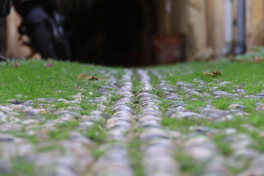 The streets are made of tiny oval shaped rocks about 1×2 or 1×3 inches in size.