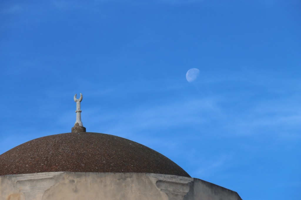 If you look carefully, you can see the moon to the right of this ancient mosque.