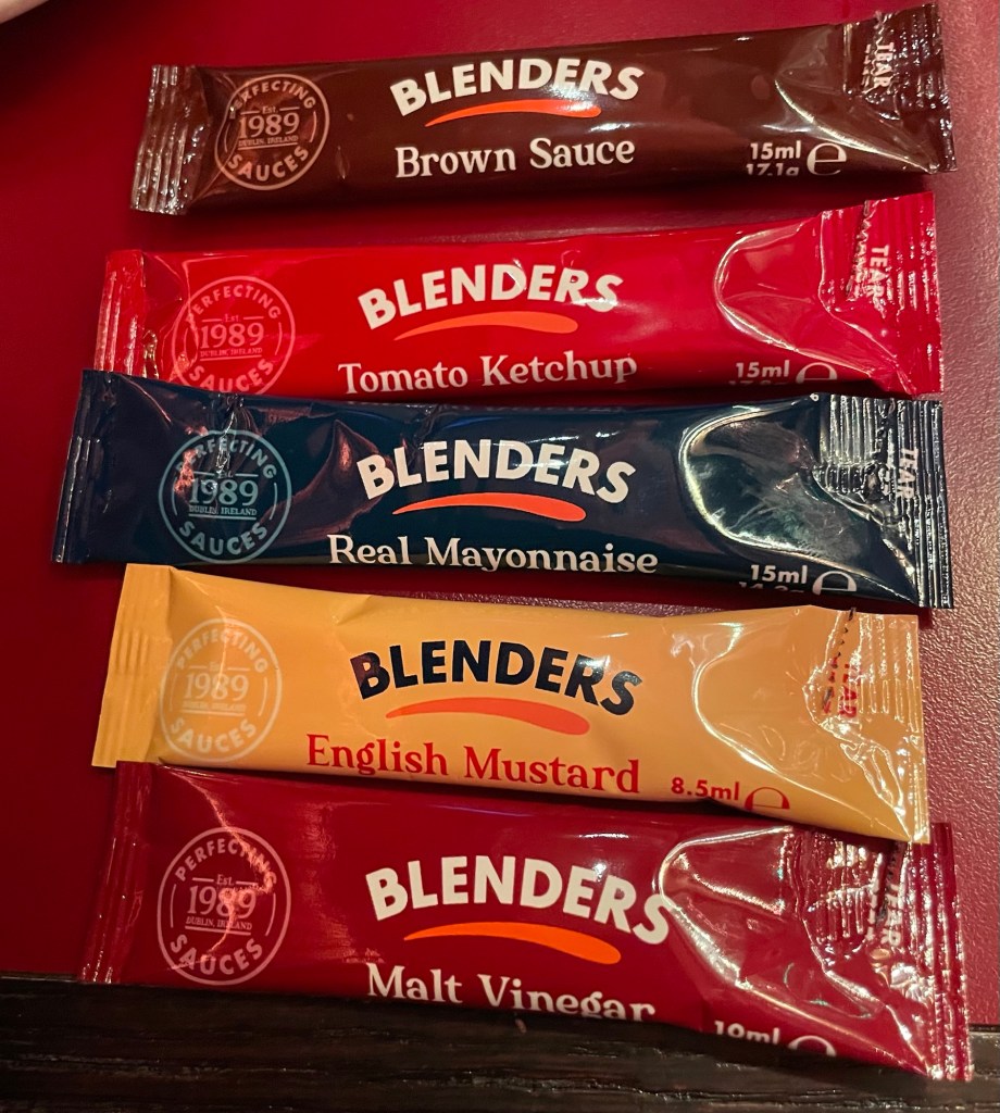 Instead of a ketchup bottle on your table, they have a bowl of individual packets of condiments. My stew today was about $35 Canadian for the bowl, but they have no sales tax, and no option to tip when you pay by credit card.