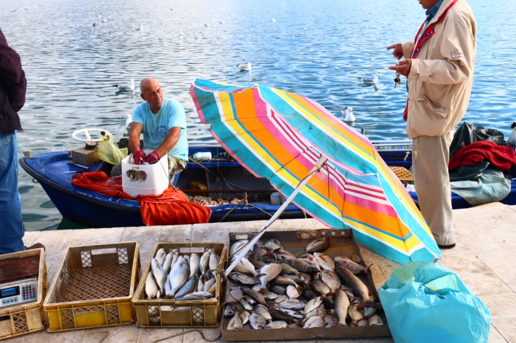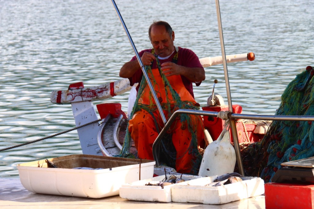The fishing boats had come in and fishermen were removing the fish that were tangled in their nets.