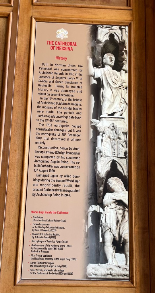 Messina has very resilient people as they have had many earthquakes including an earthquake and tsunami in 1908 which killed approximately 100,00 people! They were bombed heavily in WWII, but they have rebuilt in such a way that you would not have realized how devastated it was.