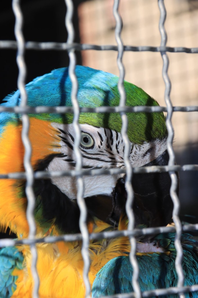 On the way back down, we found a parrot in a cage at an outdoor café.