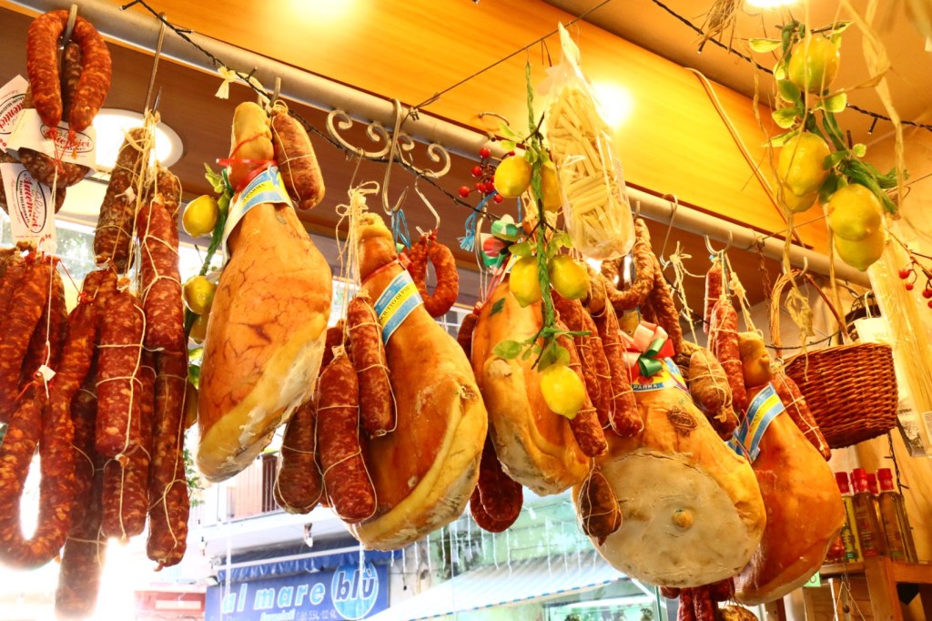 Prosciutto hanging in a butcher shop