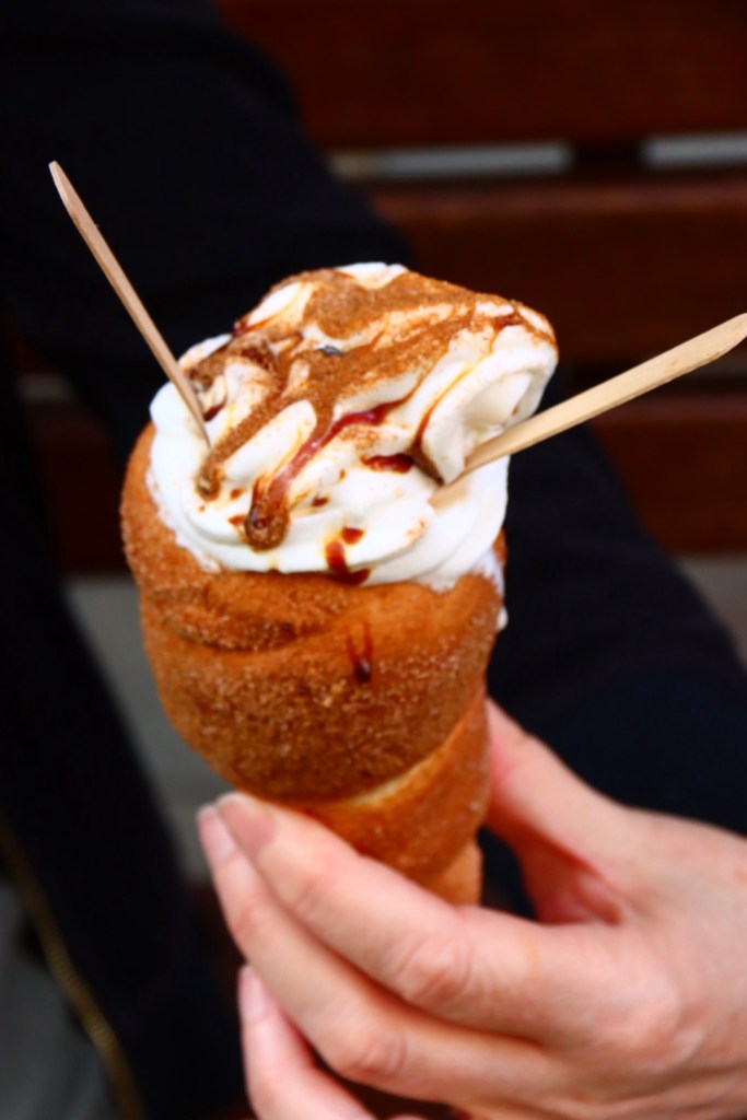 Our guide dropped us back down in the old town, and we walked back to the ship in 18 degrees and sunny weather. On our way we stopped for a chimney cake, which is basically bread dough in a cone shape which is baked and filled with various fillings. We chose vanilla ice cream.